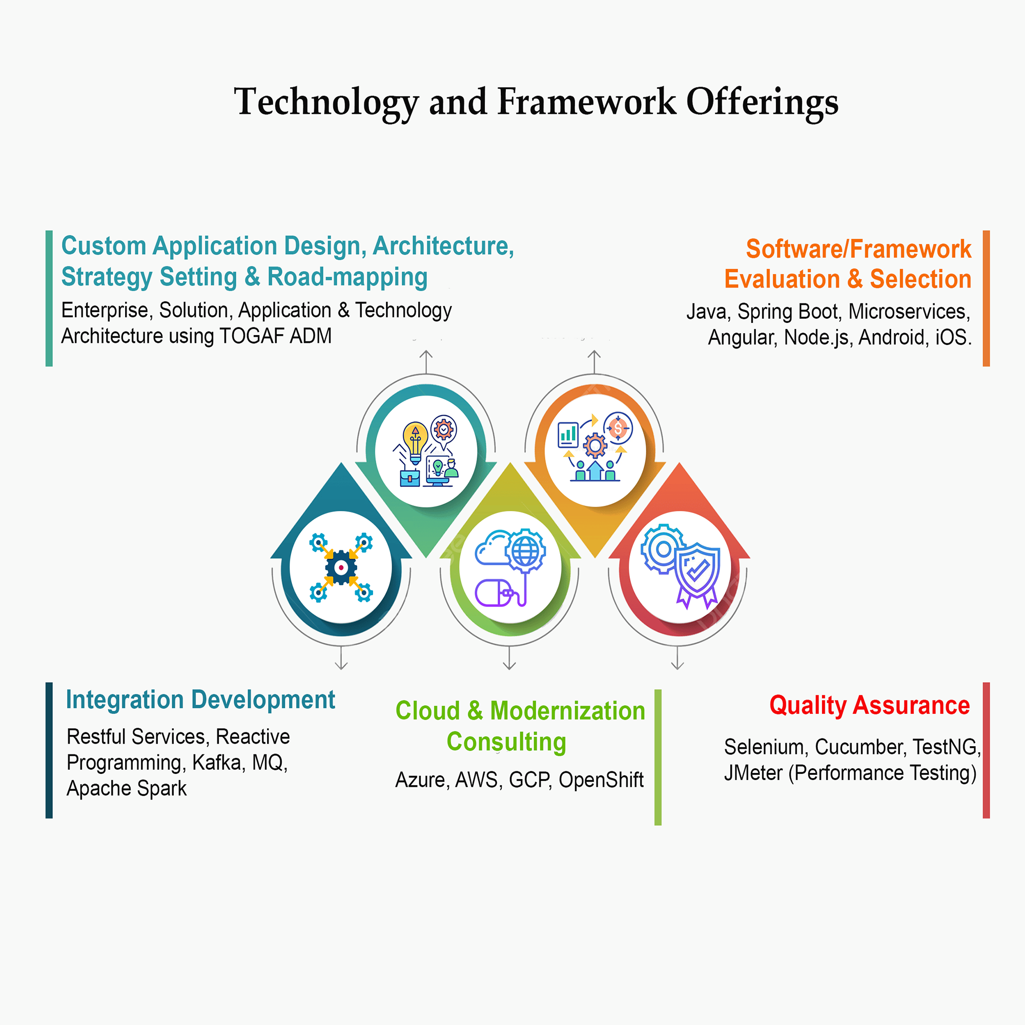 We provide end-to-end development services across modern stacks including Java, Spring Boot, Microservices, Angular, Node.js, Android, and iOS, ensuring secure, scalable, and high-performing solutions. Our TOGAF-based architecture services cover Enterprise, Solution, Technology, and Application Architectures, enabling business-IT alignment, agility, and longterm value. We deliver robust Integration Solutions with RESTful services, reactive programming, Apache Kafka, MQ, and Apache Spark to ensure seamless connectivity and realtime insights. Through Cloud Modernization on Azure, AWS, GCP, and OpenShift, we help enterprises migrate, optimize, and innovate with scalable, secure, and future-ready cloud solutions. Finally, our Quality Assurance services using Selenium, Cucumber, TestNG, and JMeter accelerate releases, reduce defects, and ensure high reliability and performance.